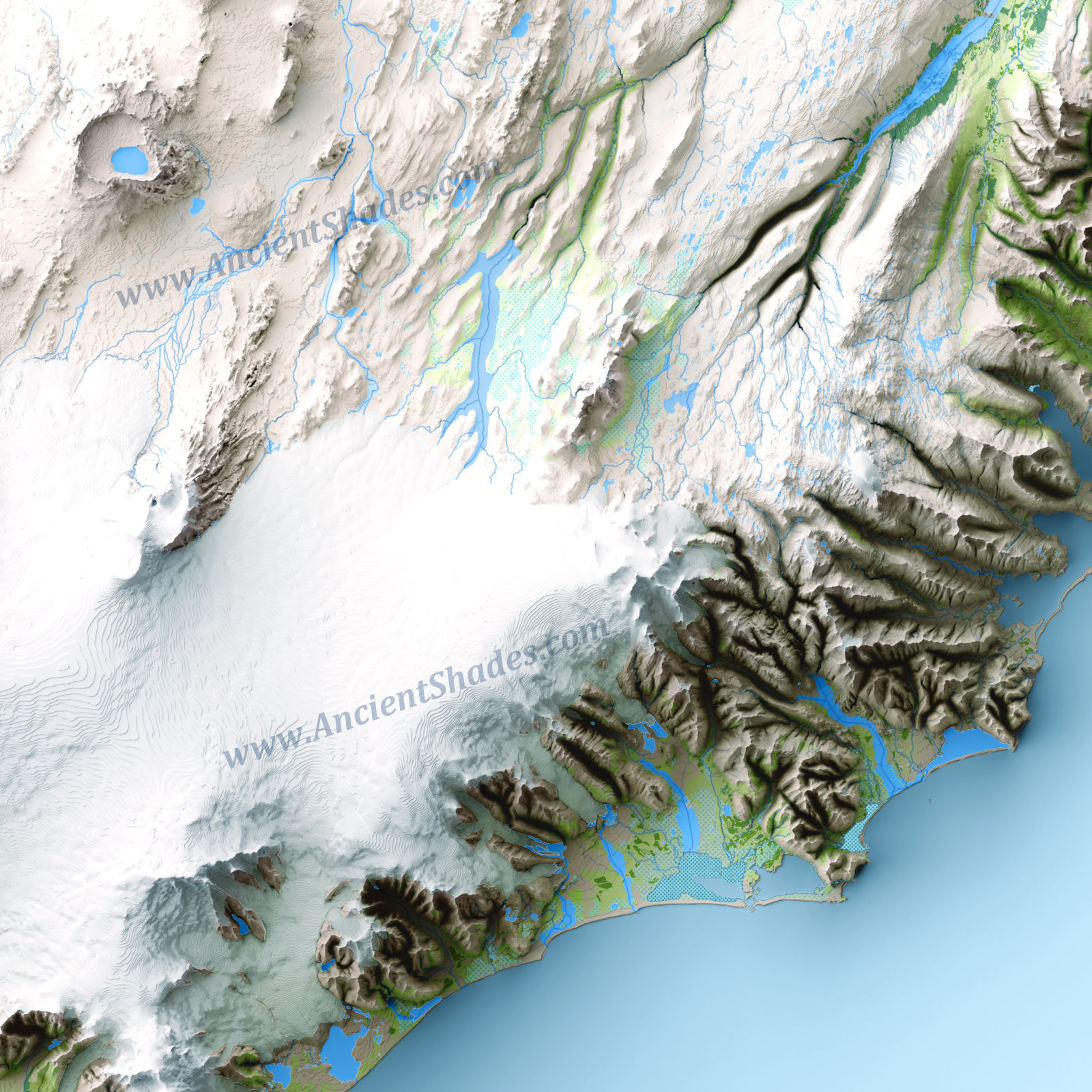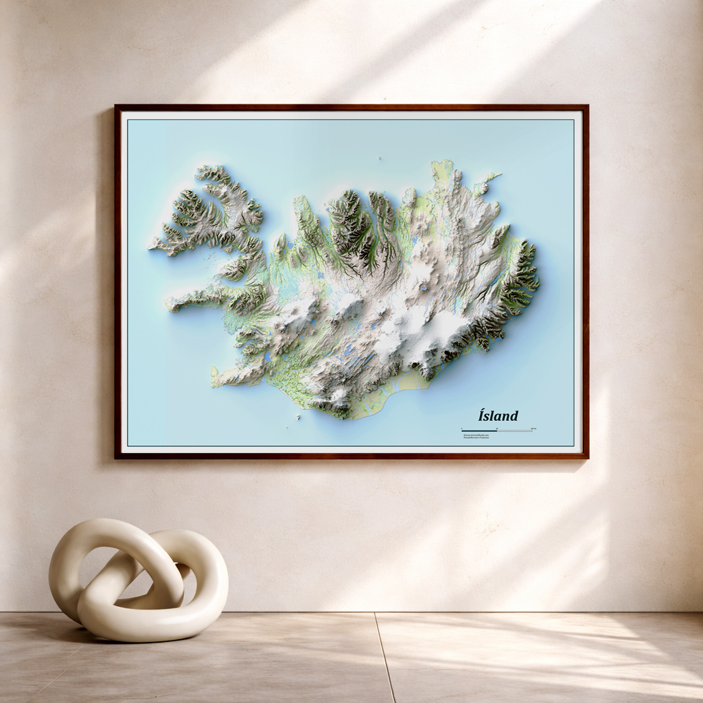 Meticulously crafted map, showcasing the island's intricate geographical tapestry in unparalleled detail. From towering glaciers and volcanic peaks to vast lava fields and winding fjords, every feature of Iceland's unique landscape is brought to life. This map captures the dramatic interplay between fire and ice that has shaped the land, offering a comprehensive view of its extraordinary terrain. Perfect for explorers, geographers, or nature enthusiasts, this map invites you to delve into the awe-inspiring topography of one of the world’s most remarkable islands.